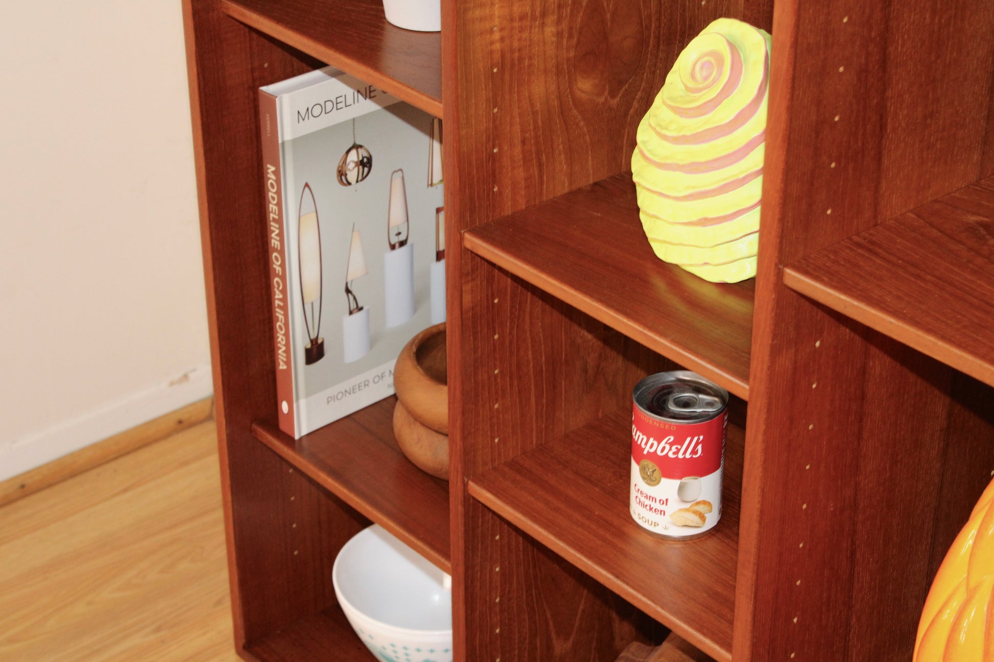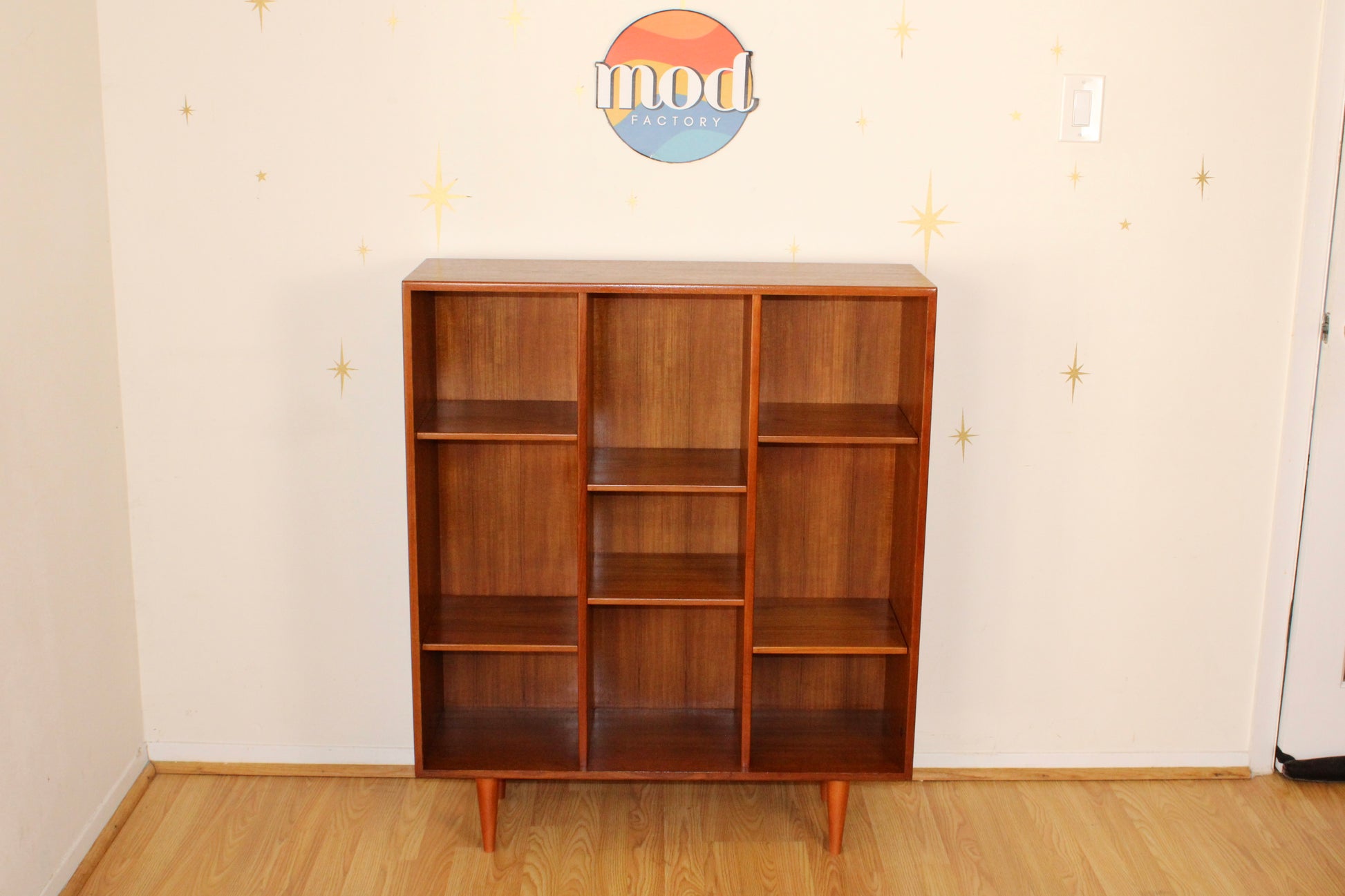 This compact Danish teak bookcase/display showcases a clean Scandinavian silhouette with three rows and six fully adjustable shelves, offering versatile space for books, ceramics, and treasured collections. Its beautifully tapered edges and refined tapered legs highlight the craftsmanship and warmth of the teak grain. Restored and in great condition with only light, age-appropriate wear, it’s a timeless, functional piece that elevates any space.