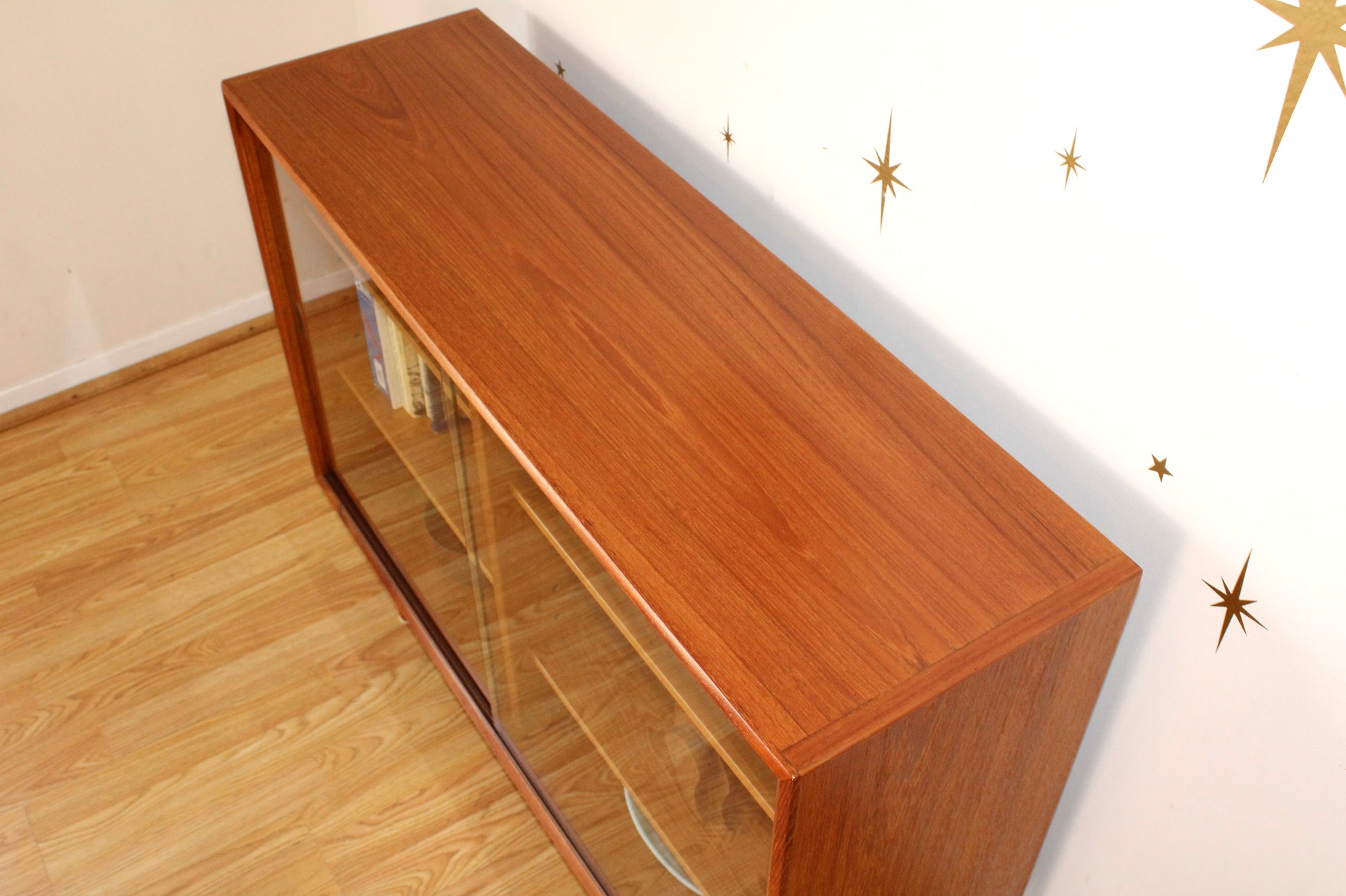 A compact Danish teak display cabinet / bookcase with smooth sliding glass doors. Features four height-adjustable shelves, it offers flexible storage to accommodate books, décor, or collectibles of varying sizes. The glass-front design allows your items to be displayed while remaining protected, making it ideal for showcasing curated collections. With its slim profile and small footprint, this piece is perfectly suited for small apartments or spaces. A classic example of Scandinavian design that adds character without overwhelming a room. In great restored condition.