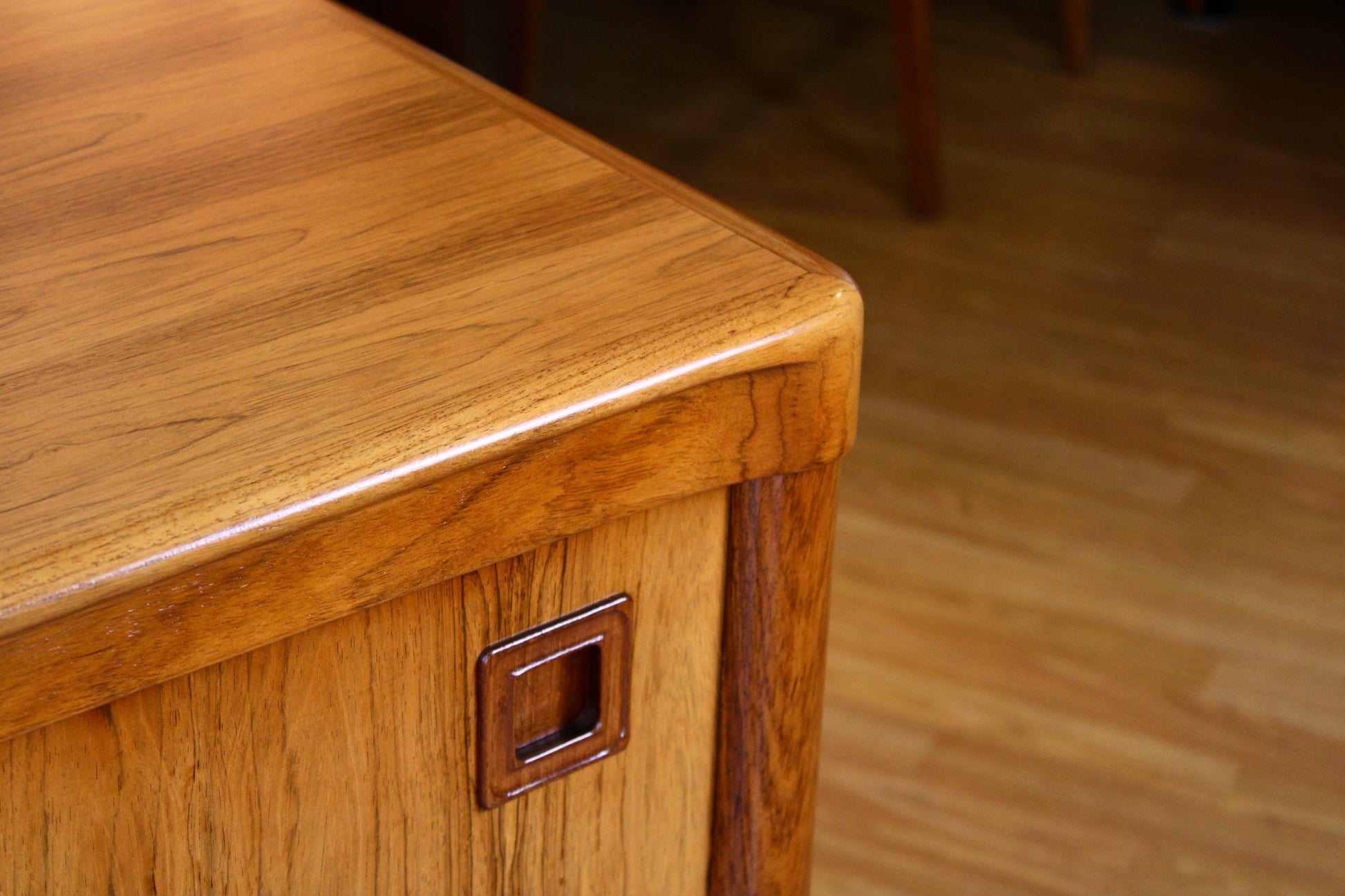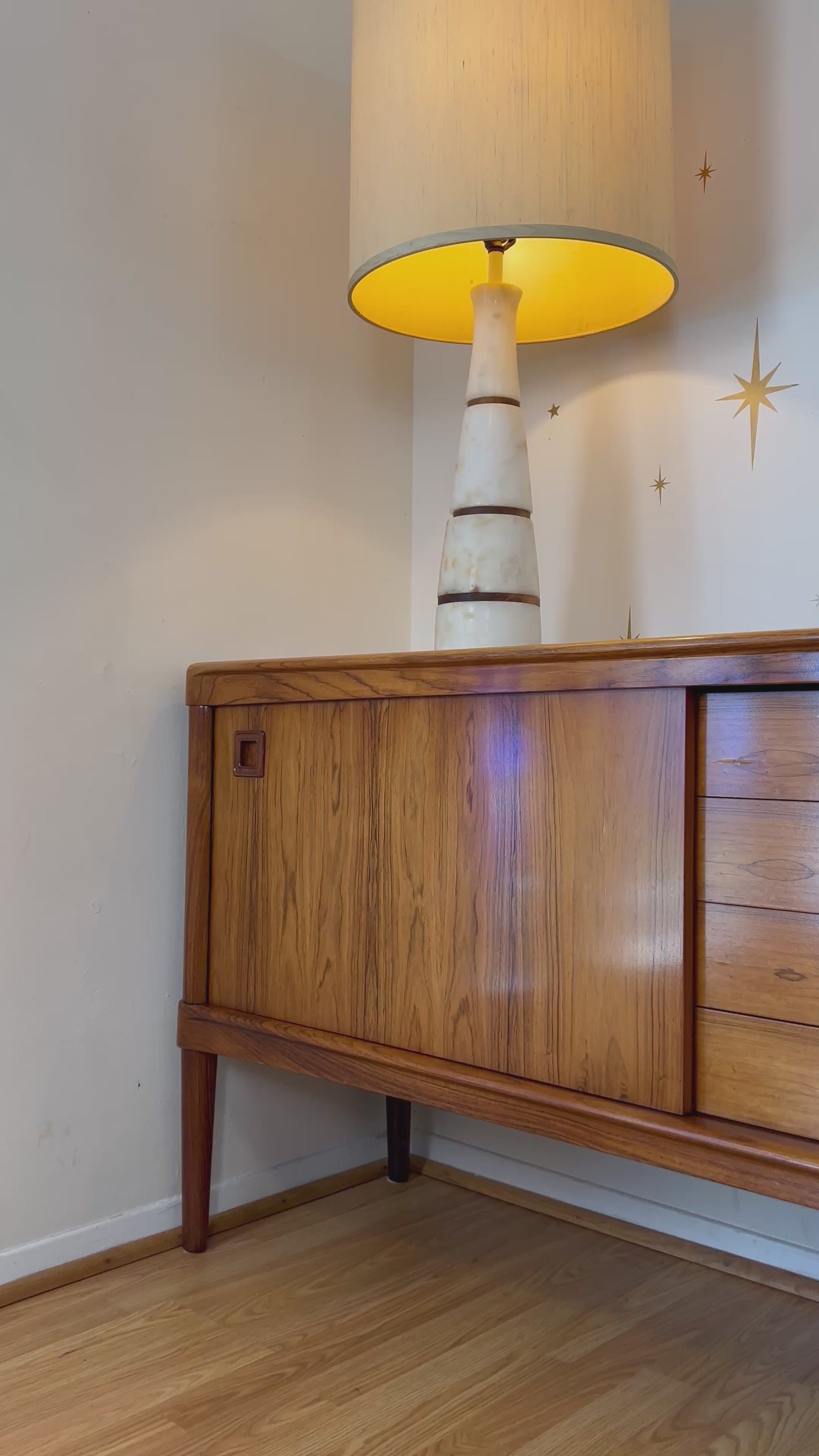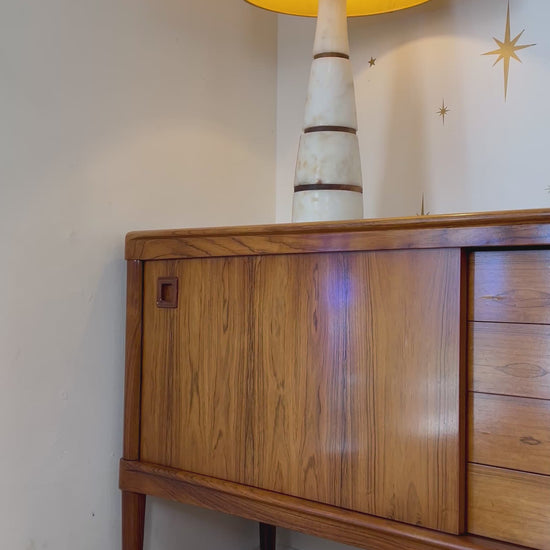 A masterful Danish rosewood sideboard by H.W. Klein for Bramin, showcasing the designer’s hallmark blend of sculptural form and functionality. Crafted in richly figured rosewood, its striking grain enhances the elegant silhouette, highlighted by gentle curves and refined details. Two sliding doors conceal adjustable shelving, while a central bank of four drawers offers ample storage, all accented by Klein’s uniquely designed square pulls. Exquisitely crafted and beautifully proportioned, this is an iconic example of Danish modern design at its very best. In excellent restored condition.