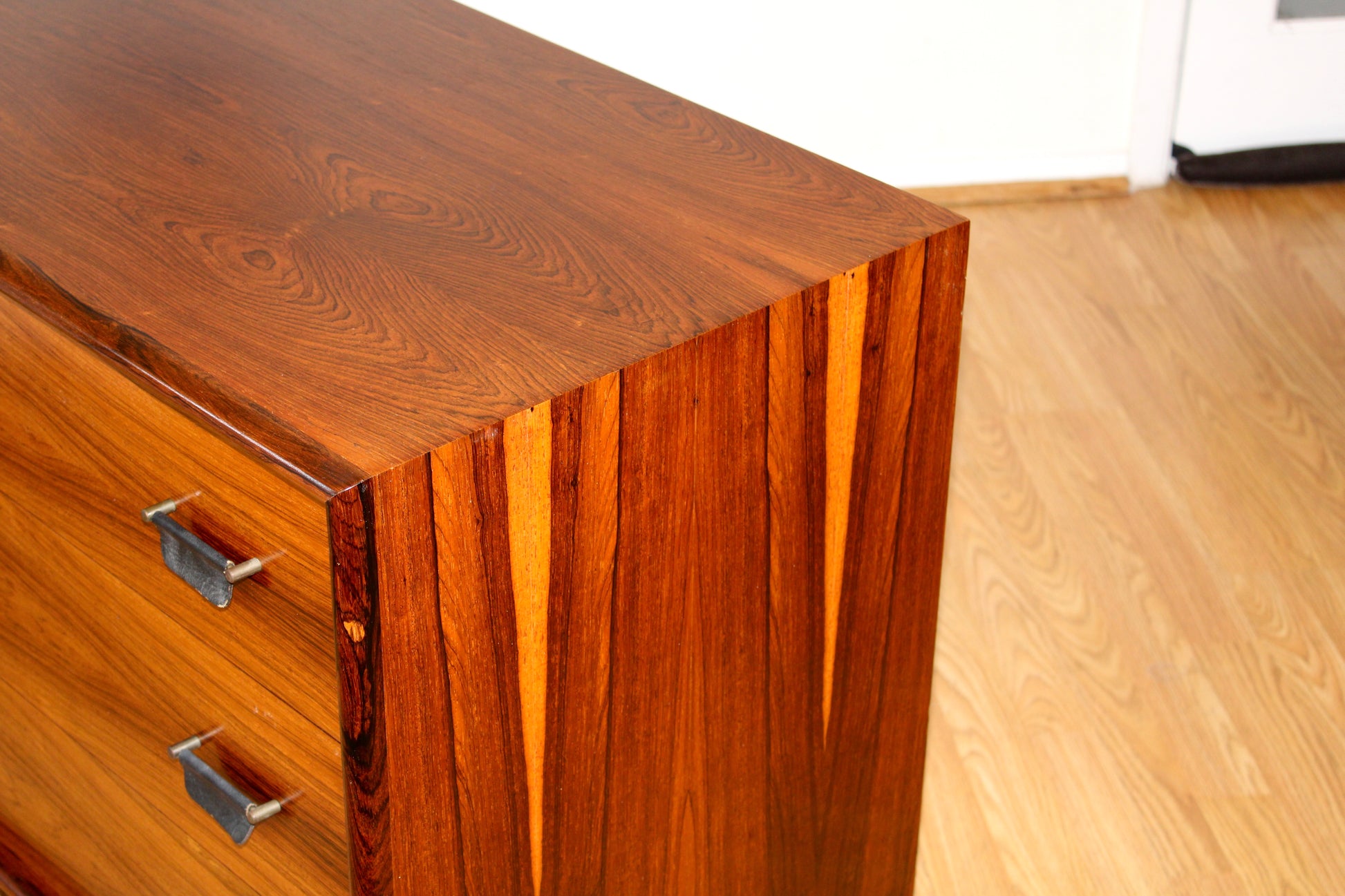 An exceptional mid-century modern rosewood low dresser/credenza, manufactured in Canada, showcasing incredible craftsmanship and richly figured rosewood that flows beautifully across the drawer fronts. Featuring six smooth-sliding drawers adorned with unique brass and black leather strap pulls, this piece is as functional as it is visually captivating. Designed with clean lines and refined details, it presents beautifully from every angle and has been professionally restored to excellent condition, making it a timeless addition to any modern interior.