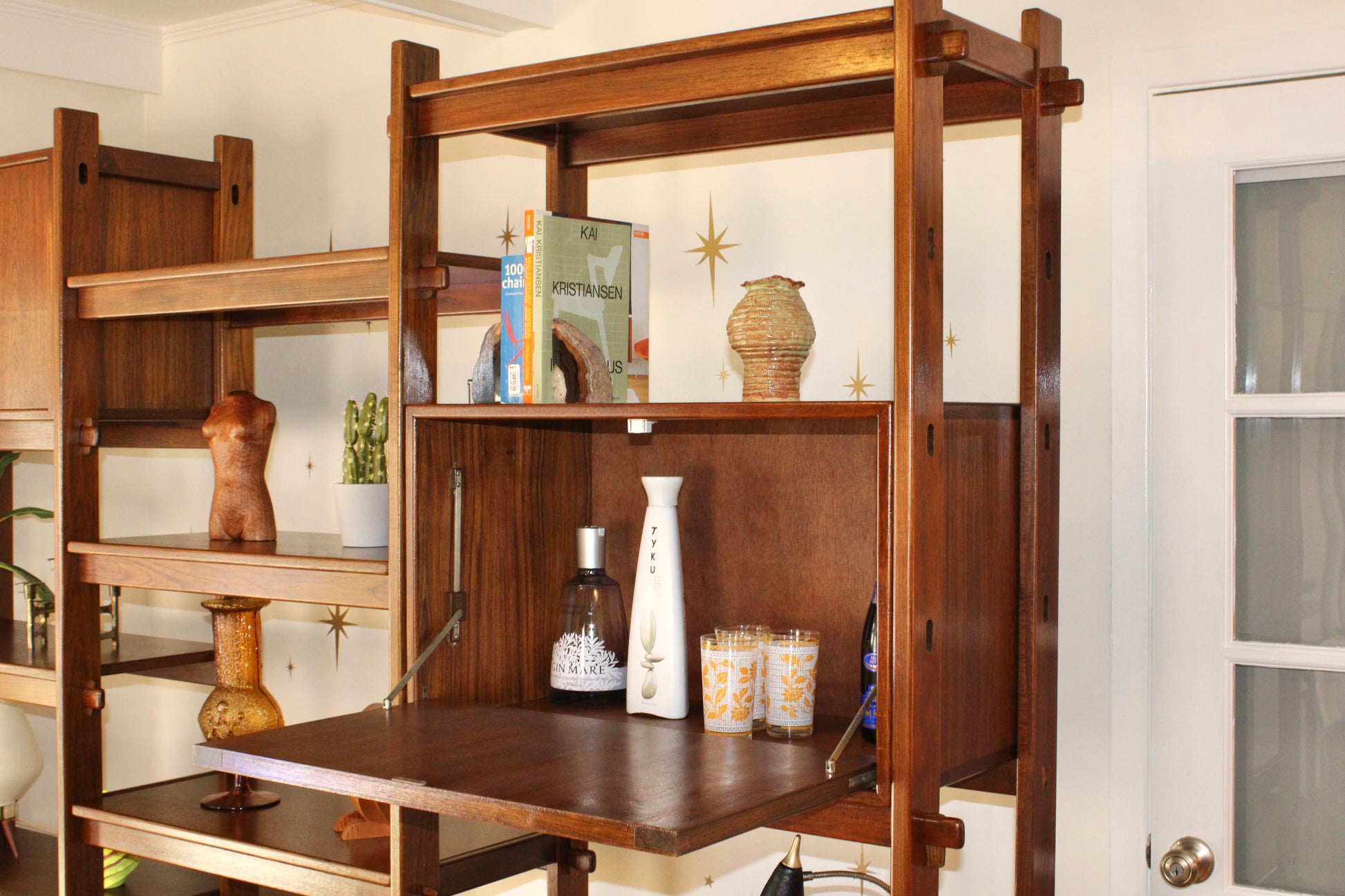 This freestanding 3-bay wall unit doubles as a room divider, offering both beauty and versatility. The left bay features a cabinet and a bank of three drawers for ample storage, while the right bay includes a desk with a drawer and a flip-down cabinet ideal for use as a stylish liquor cabinet. The center bay showcases four floating shelves, perfect for displaying your favorite treasures. Designed with a finished back and reversible compartments for effortless reconfiguration, this piece is as functional as it is sculptural. Its most remarkable feature is the seamless, hardware-free construction—each element is held together by precision-fit dowels, creating a clean, minimalist aesthetic that highlights expert craftsmanship. In great restored condition.