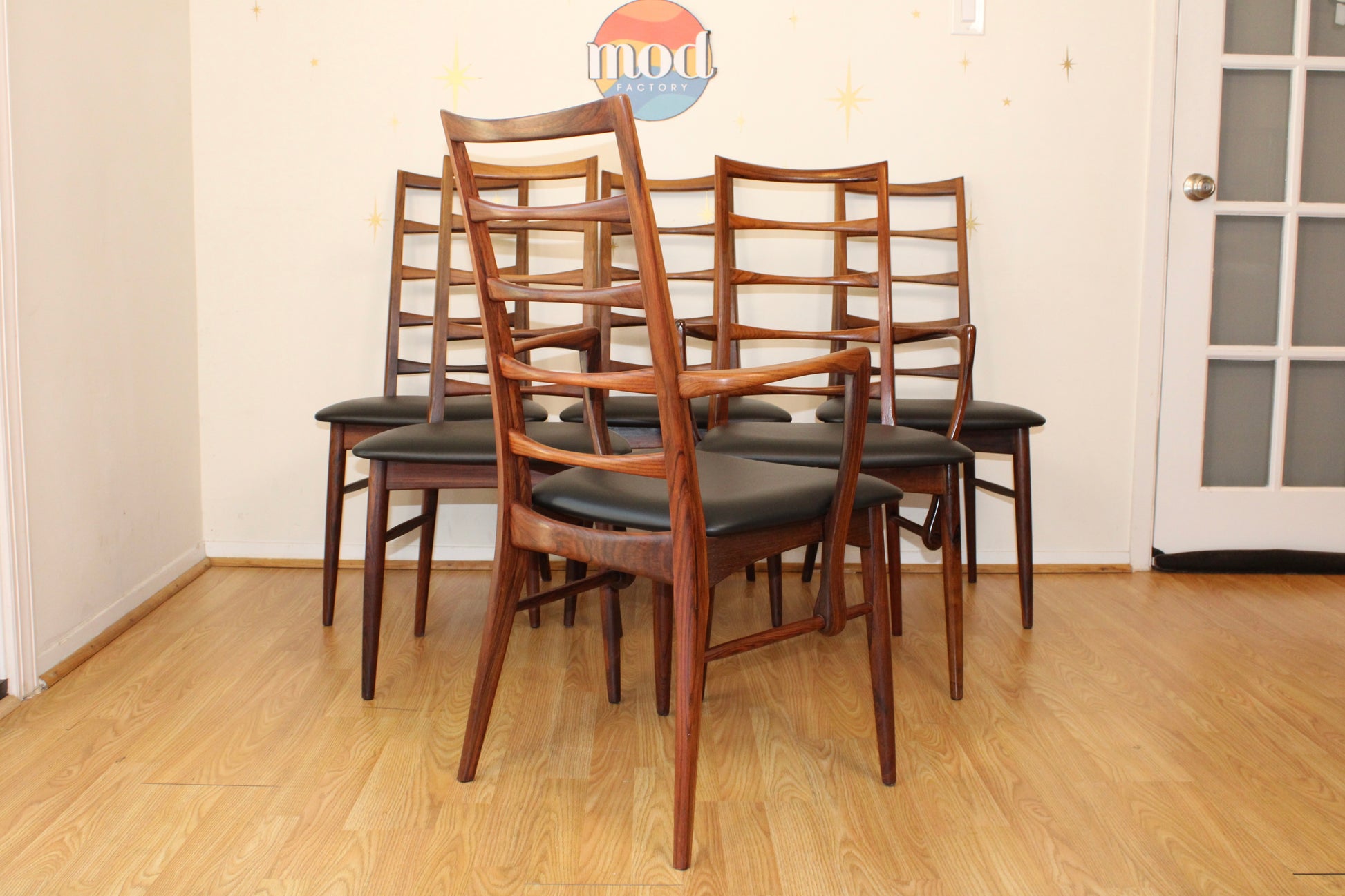 Set of six “Lis” Danish rosewood dining chairs designed by Niels Koefoed for Koefoeds Hornslet. These beautifully crafted chairs showcase stunning rosewood grain and elegantly curved lines that highlight the timeless appeal of Danish modern design. Each chair retains its original black leather upholstery, all in excellent condition with no rips or tears. The sculpted backs and tapered legs create a refined, graceful silhouette, while the warm rosewood tones add depth and sophistication to any dining setting. A superb example of Scandinavian craftsmanship, this set is one of our favorites for both design and comfort.