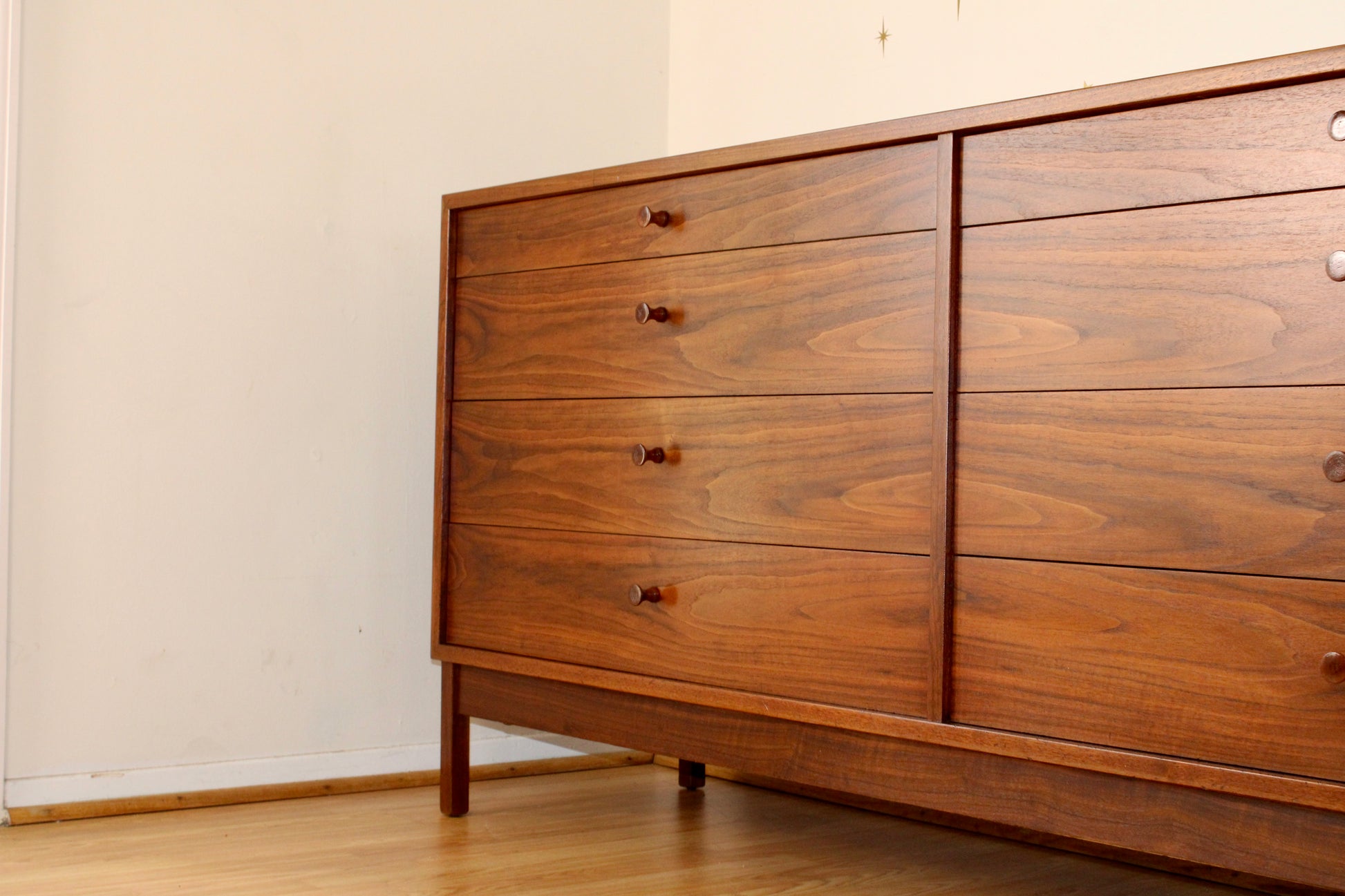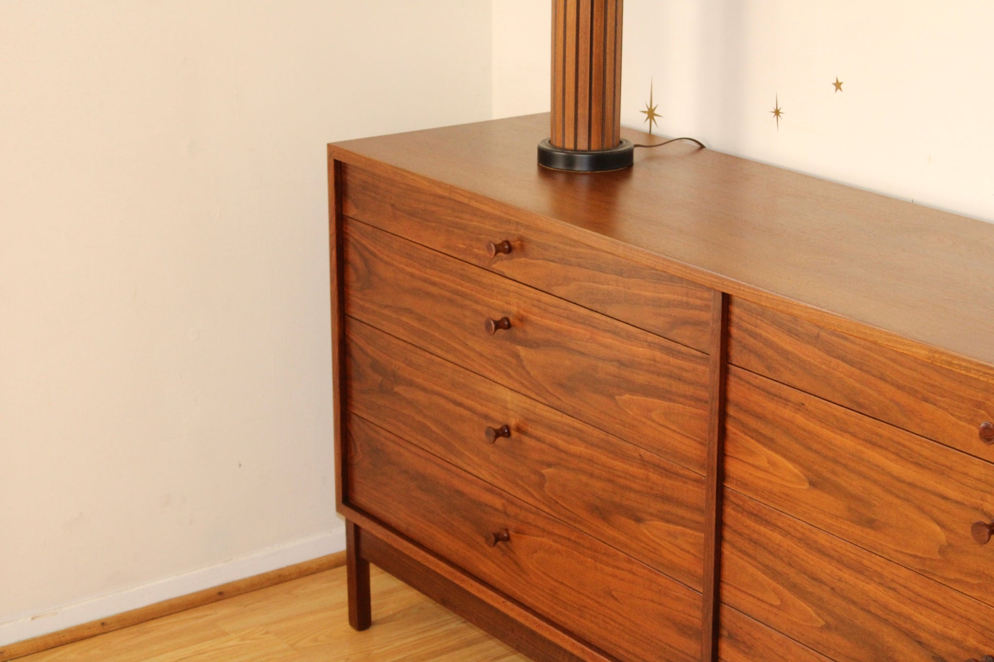 Introducing a remarkable Mid-Century Modern walnut double dresser, designed by Richard Artschwager, is a stunning example of both art and craftsmanship. Produced exclusively in his NYC studio from 1953 to 1958 before a fire tragically destroyed it, this piece is a rare and exceptional find.