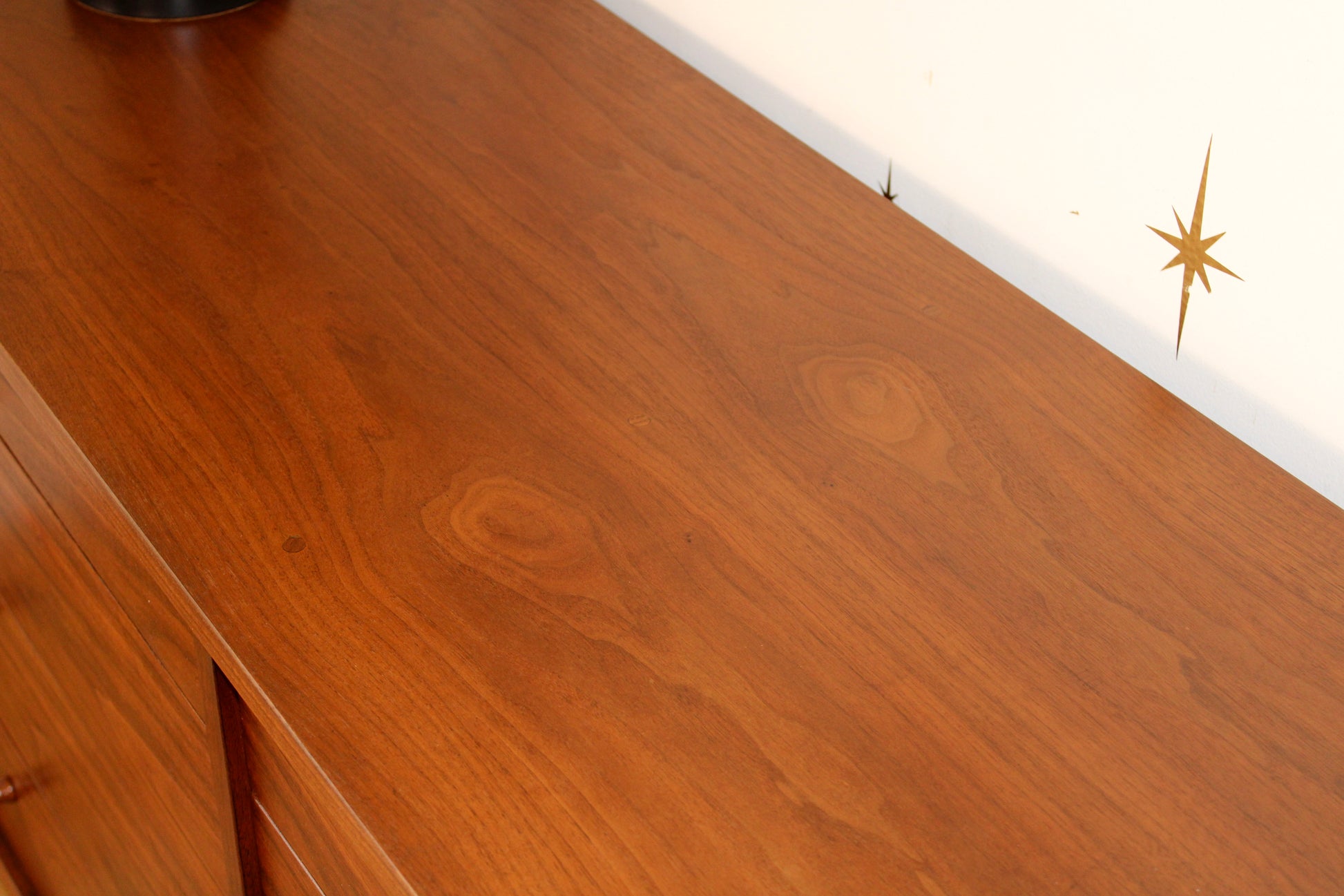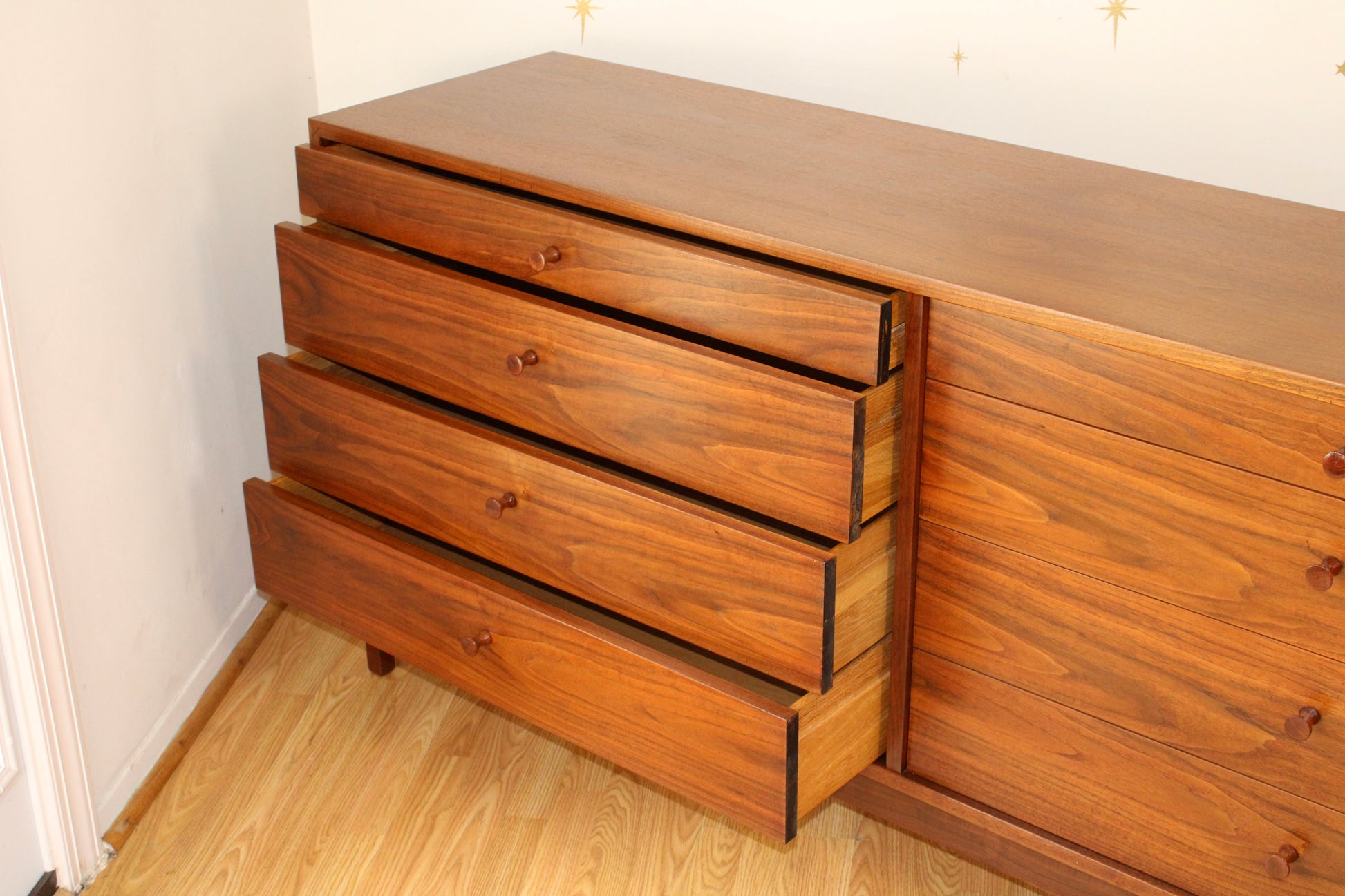The dresser showcases exquisite American craftsmanship of this era. The exterior highlights the extraordinary beauty of walnut wood grain, while the solid walnut pulls and legs add to its elegance. The case features mitered corners with exposed walnut splines and dowels on top, further demonstrating Artschwager's meticulous attention to detail. In excellent restored condition.
