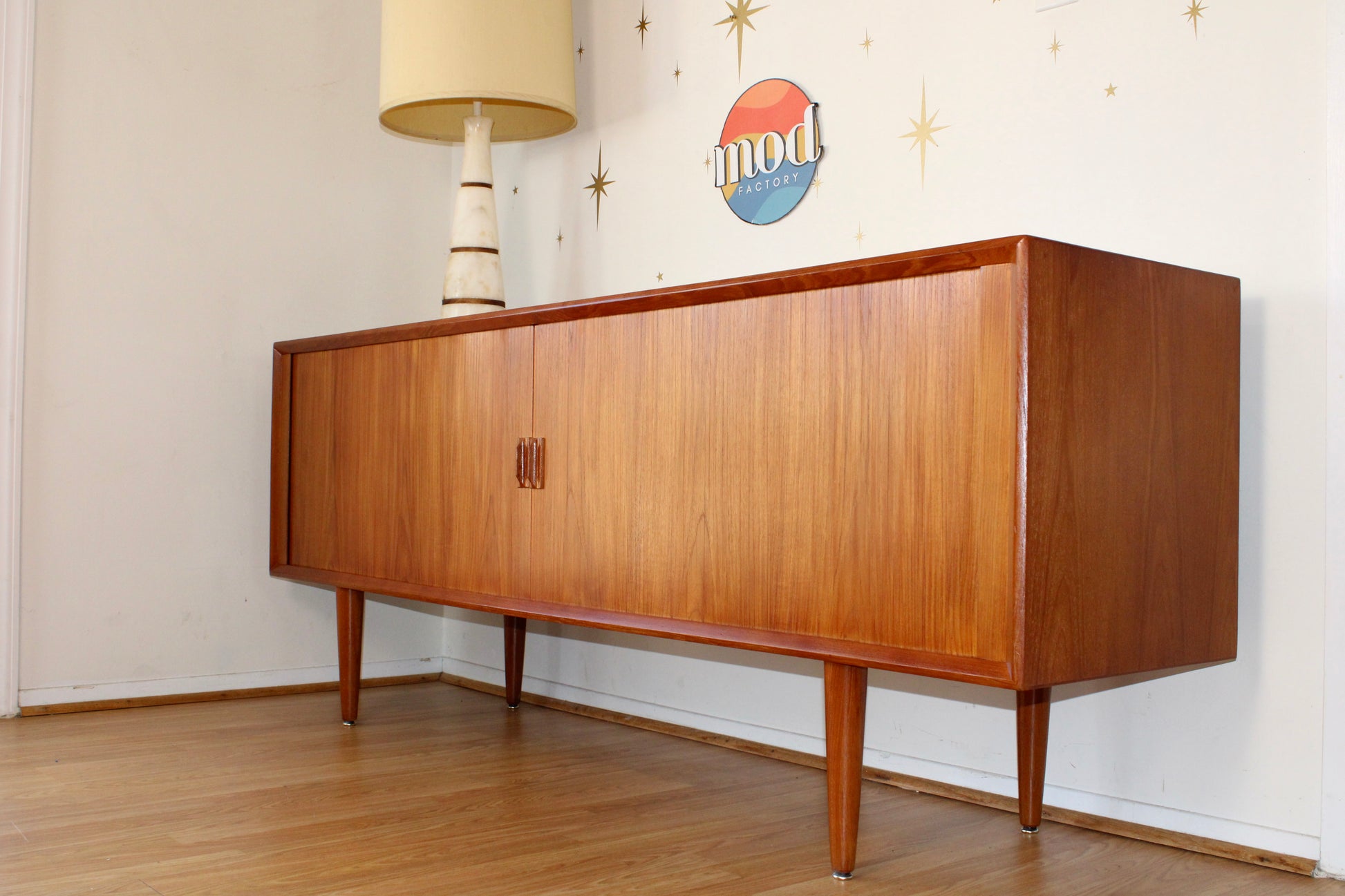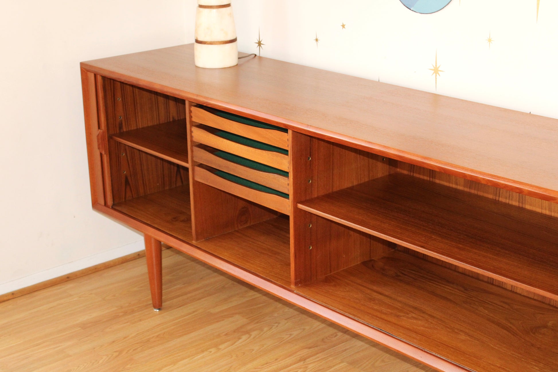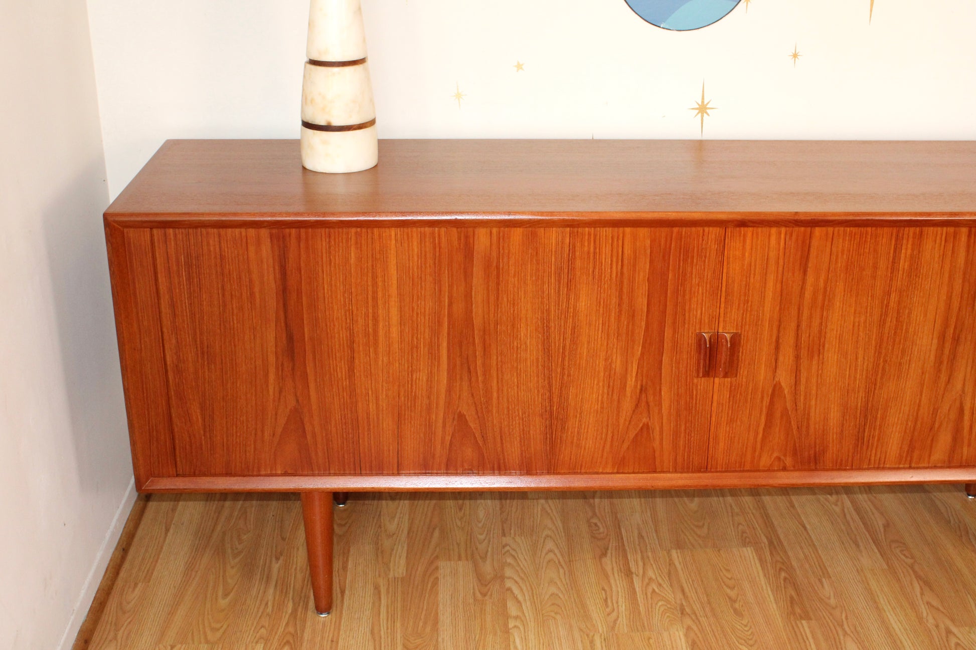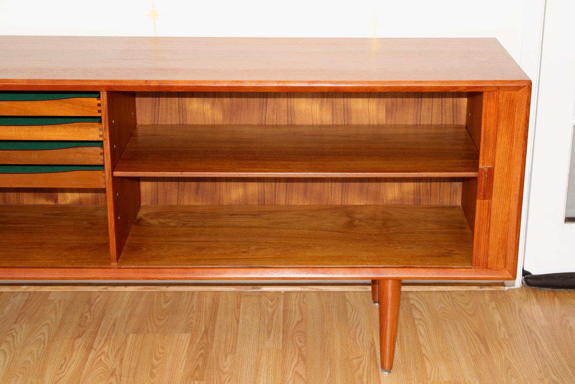 Beautiful Danish teak tambour door sideboard designed by Svend Åage Larsen for Faarup Møbelfabrik, circa 1960s. This exceptional piece showcases richly grained teak on all sides and features two smooth-gliding tambour doors that reveal a spacious interior with four felt-lined drawers and two adjustable shelves. Expertly crafted with clean lines and refined proportions, the sideboard embodies the elegance and functionality of Danish modern design—perfect as a statement piece for any dining room, living room, or office. In excellent restored condition.