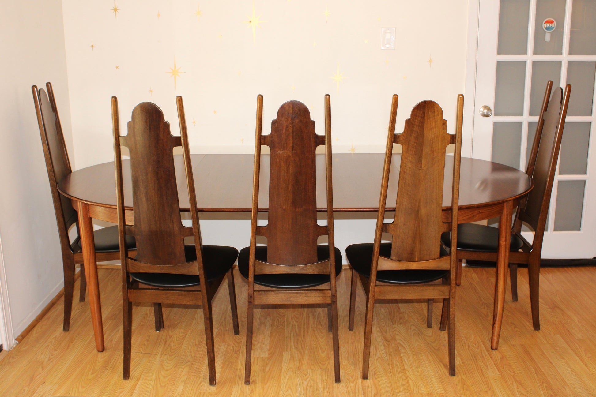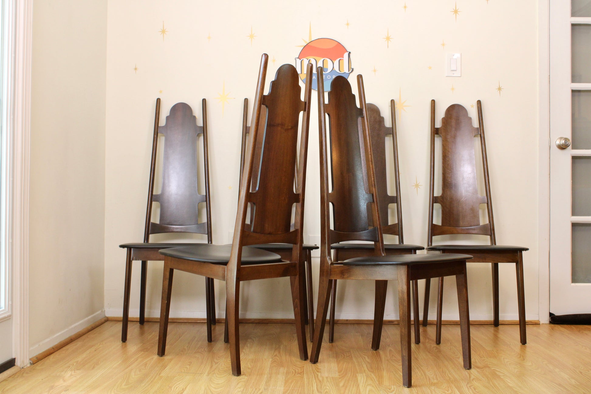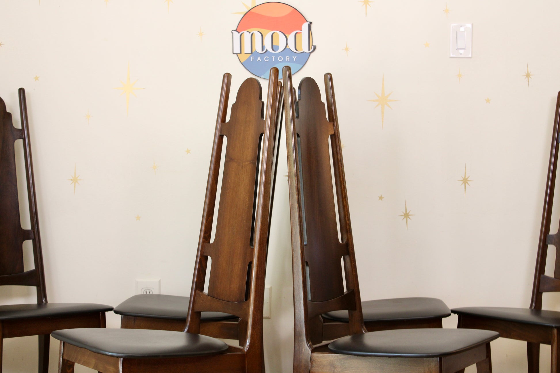 A unique set of six walnut dining chairs, beautifully crafted in Yugoslavia. These chairs carry a dark, moody presence, enhanced by their rich walnut frames and elongated, sculptural backrests-an unusual and eye-catching design detail. The original black leather upholstery remains in excellent condition. A rare and distinctive set that blends elegance with a dramatic edge—perfect for making a statement in any dining space.