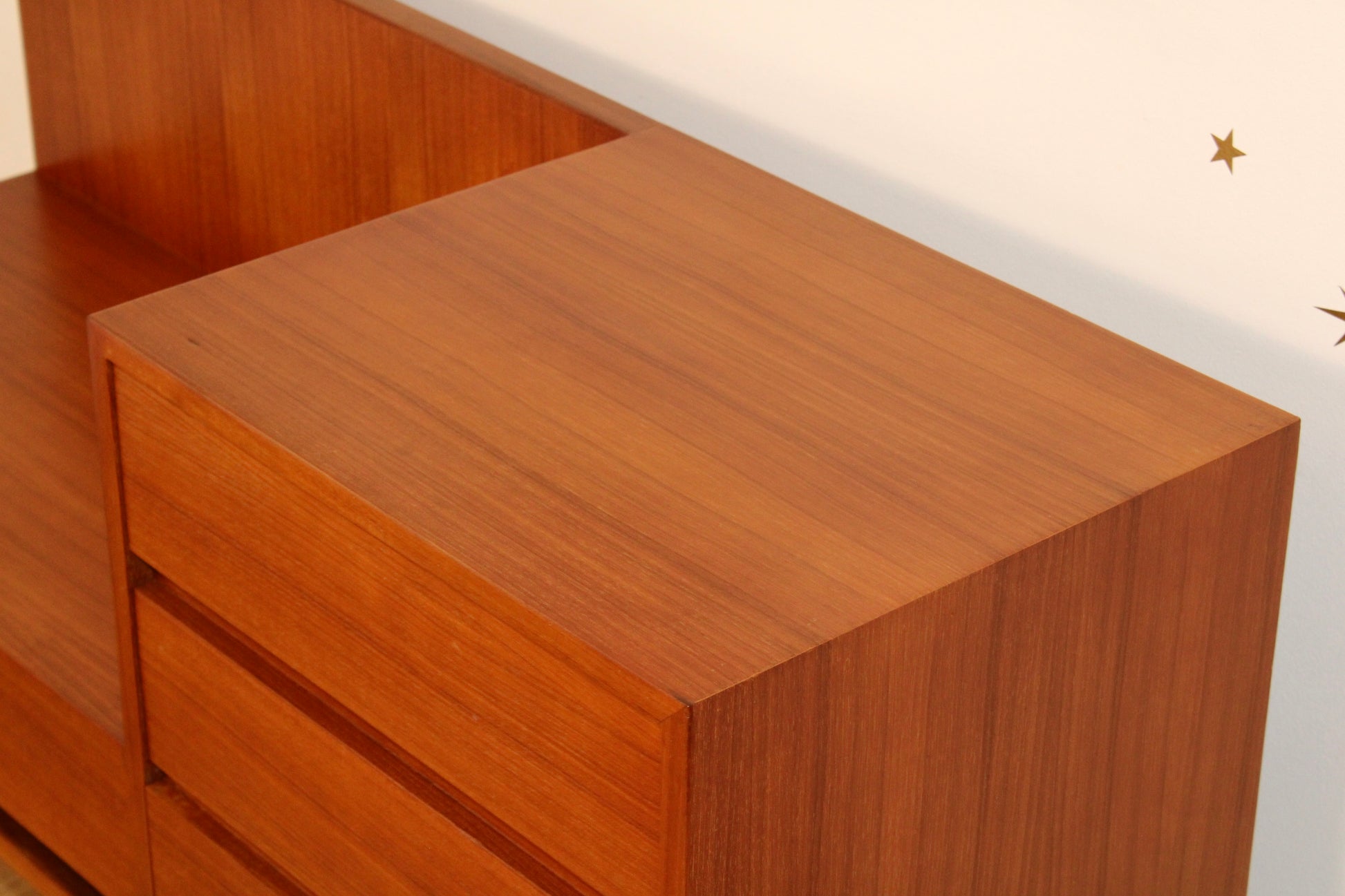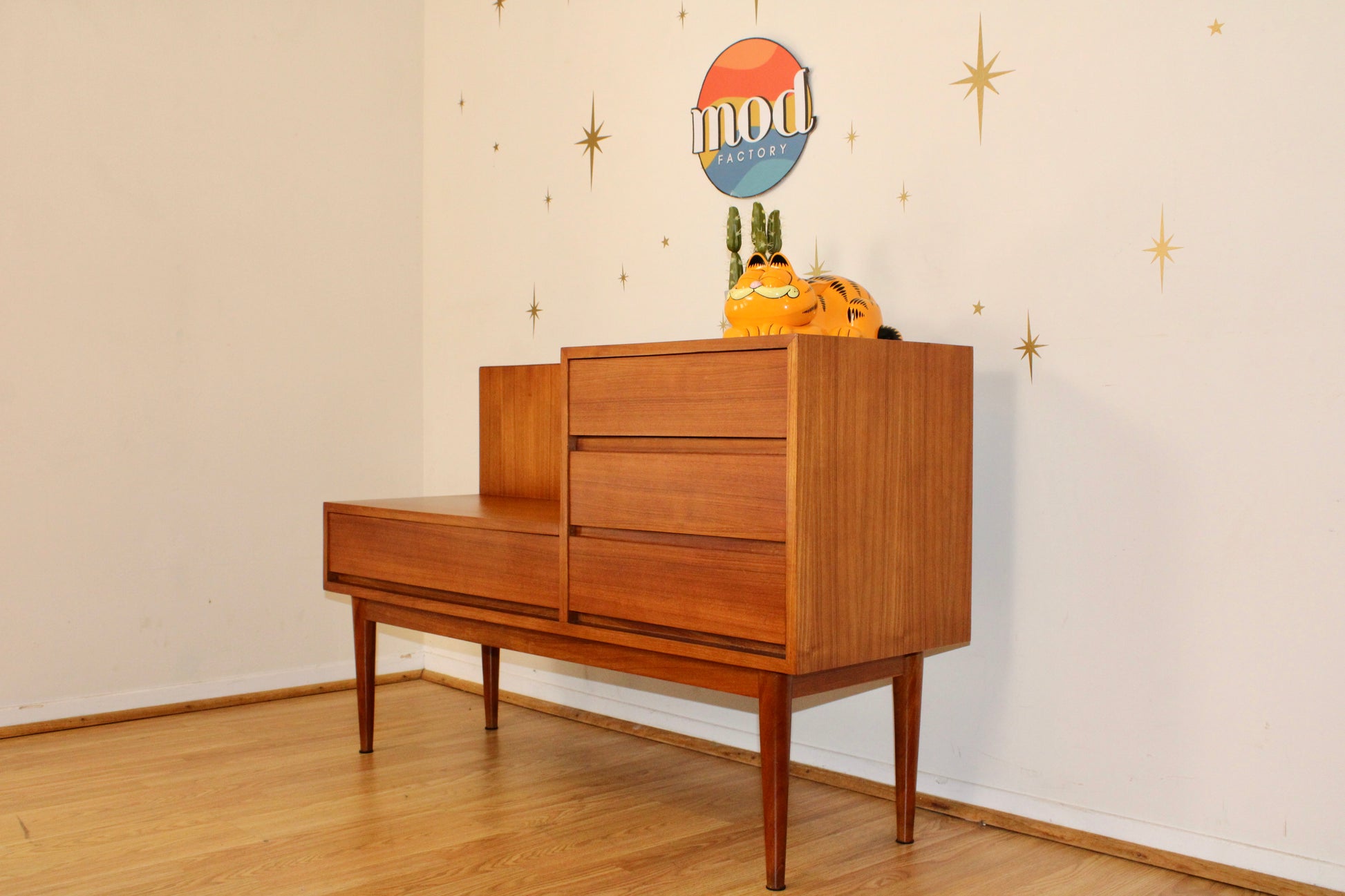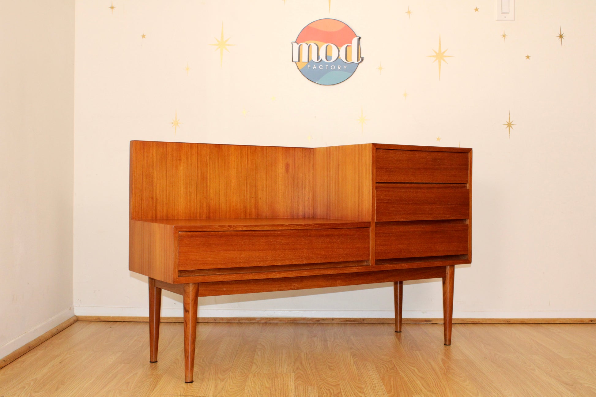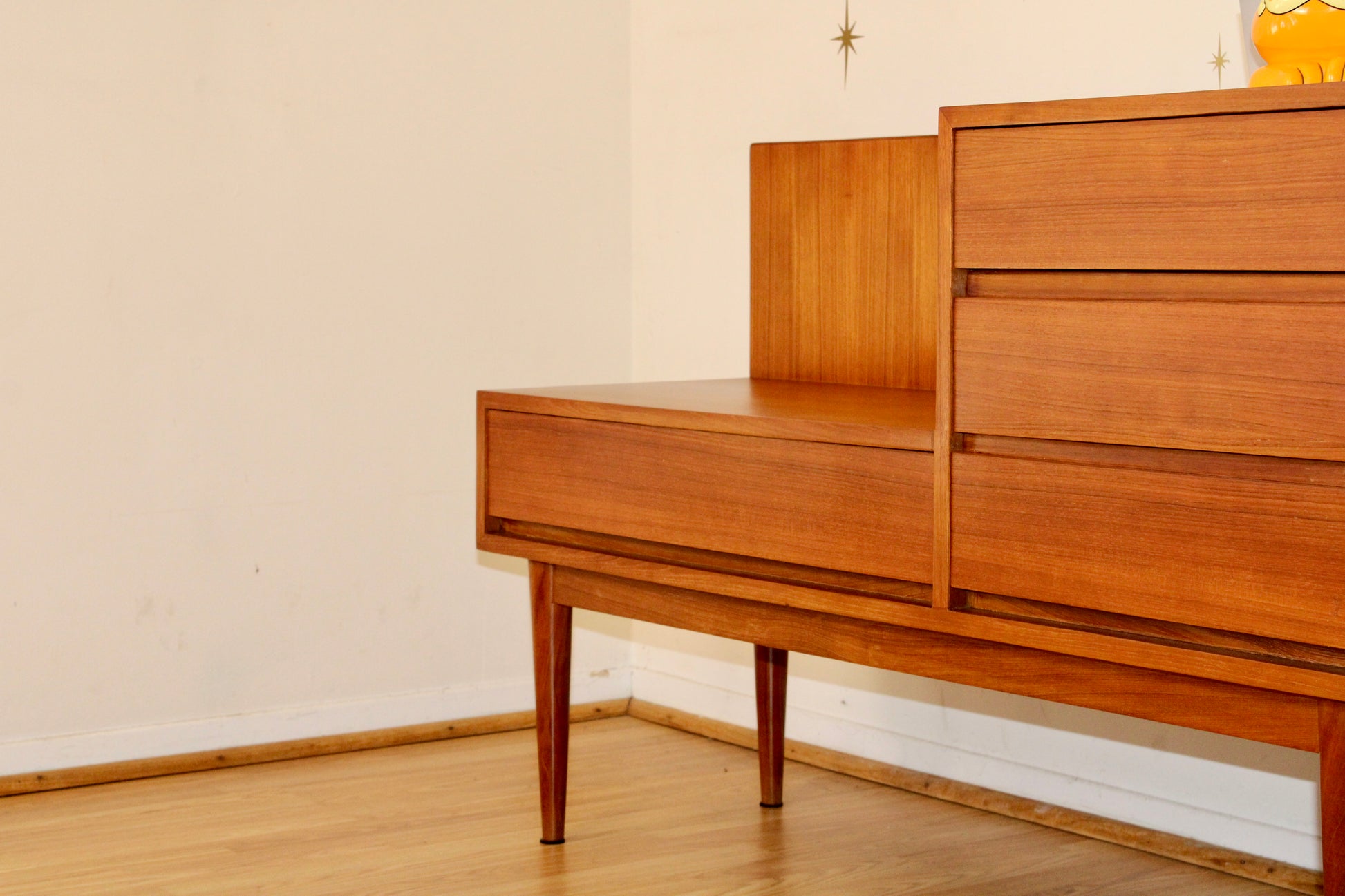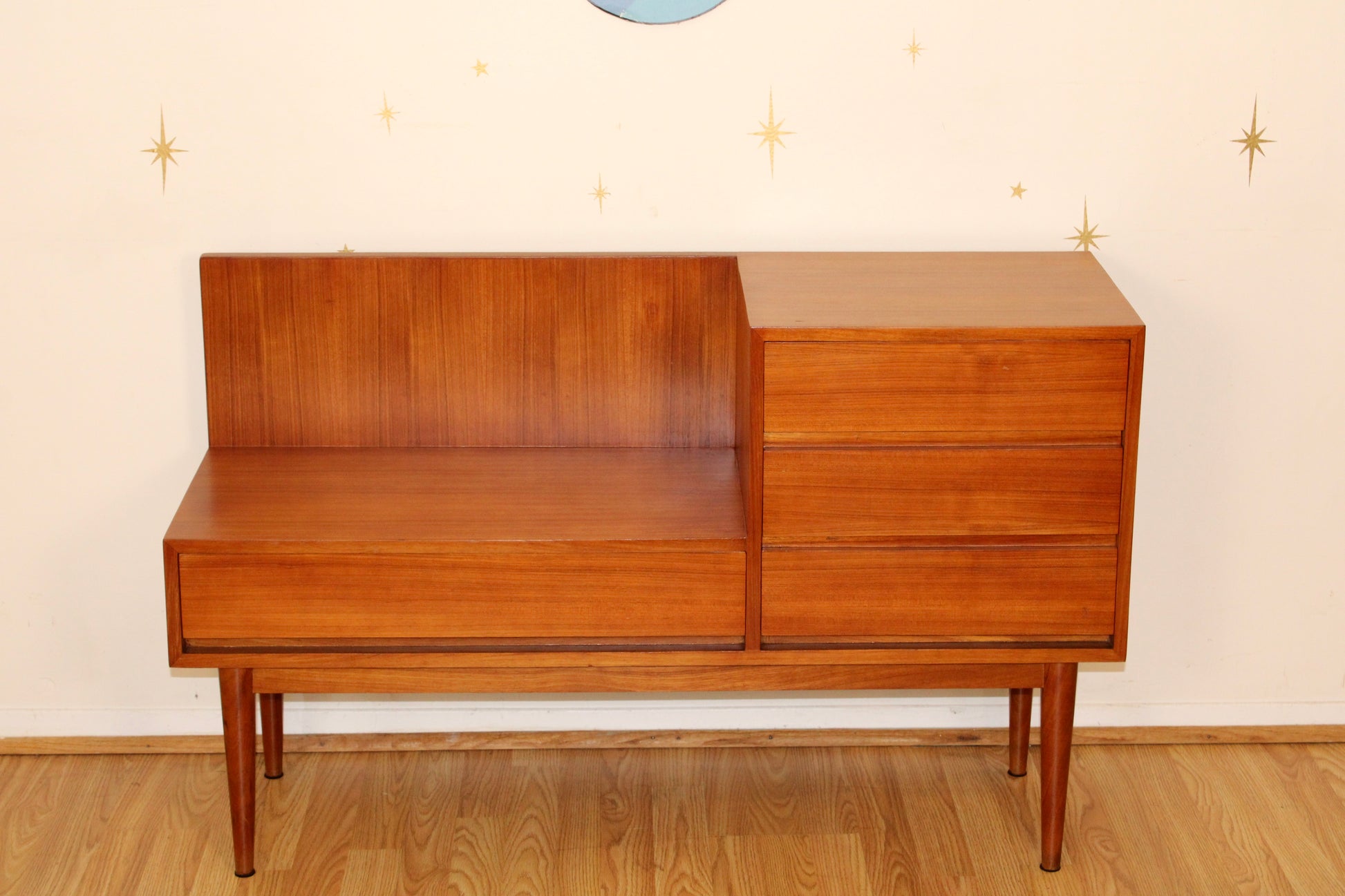 A beautiful teak phone/gossip bench with timeless scandinavian charm, featuring a bank of three drawers on the right and a spacious drawer beneath the seat—perfect for stashing keys, mail, and everyday essentials. This versatile piece is both functional and stylish, making it an ideal addition to any entryway, hallway, or cozy nook. In excellent restored condition.